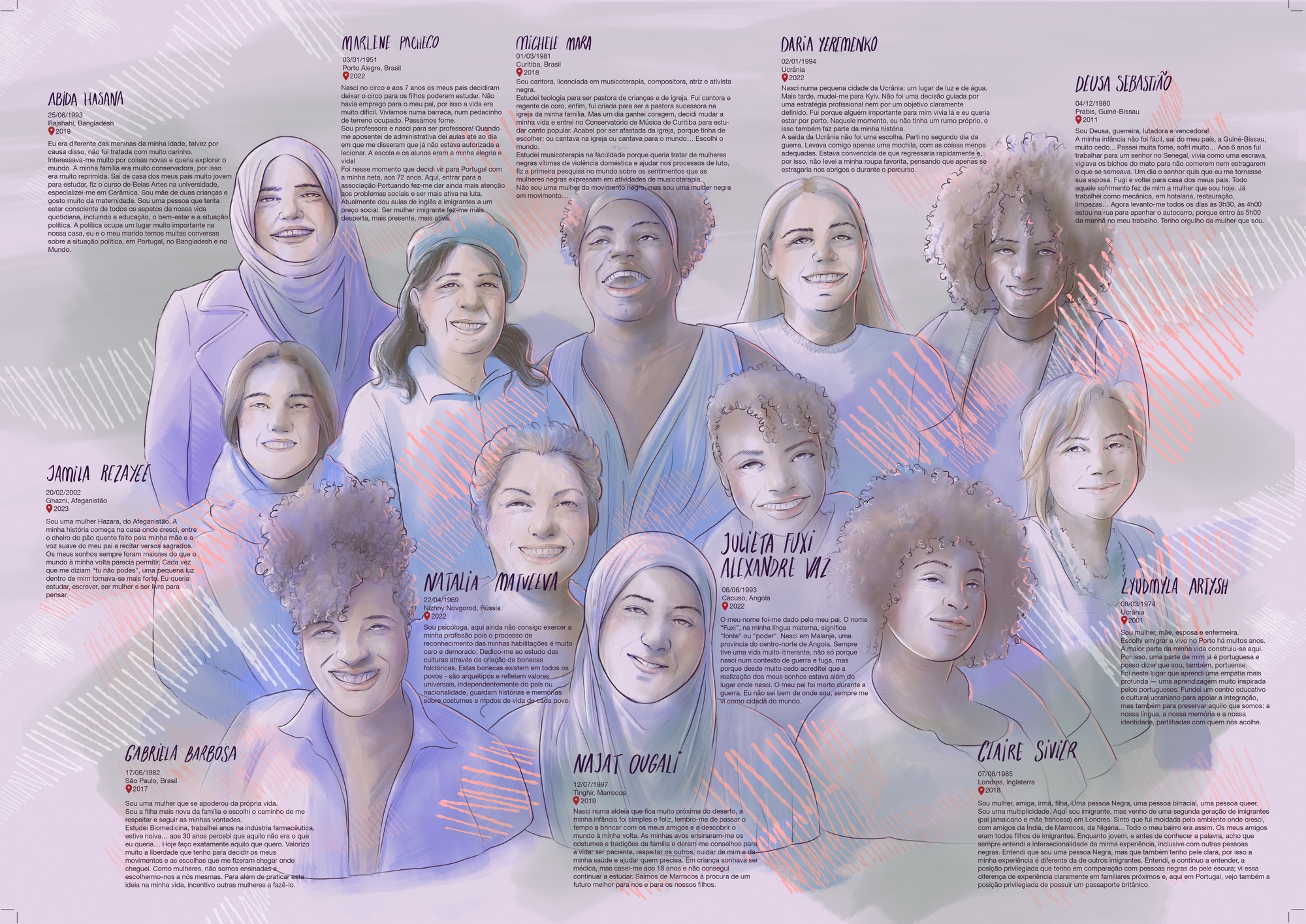 As histórias foram partilhadas por mulheres migrantes que vivem ou trabalham no Porto, através de uma open call realizada em Outubro de 2025. Foram privilegiadas narrativas de mulheres de diferentes geografias, contextos, idades e que, de alguma maneira, têm uma atuação em contexto coletivo.